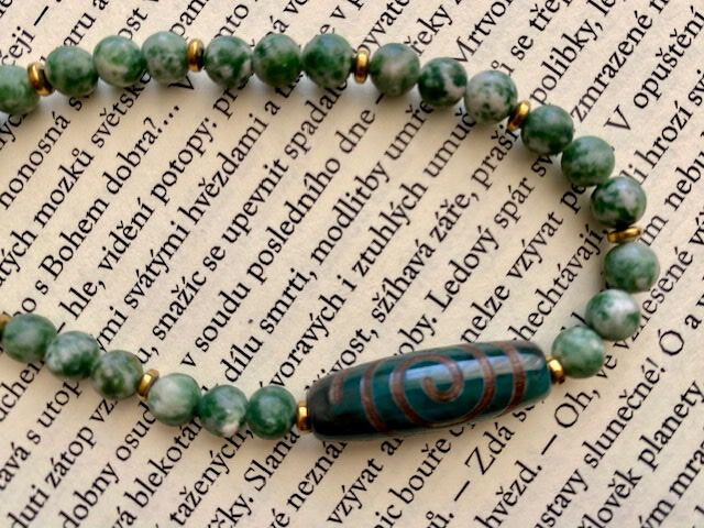Tibetské korálky DZI jsou speciálním druhem achátu, který je pomocí vybroušení ozdoben mystickými znaky. DZI slouží od nepaměti jako ochranný amulet a zároveň představují velice důležitou součást tibetské kultury. A právě v tomto náhrdelníku je zakomponován korálek DZI Spirála vesmíru.