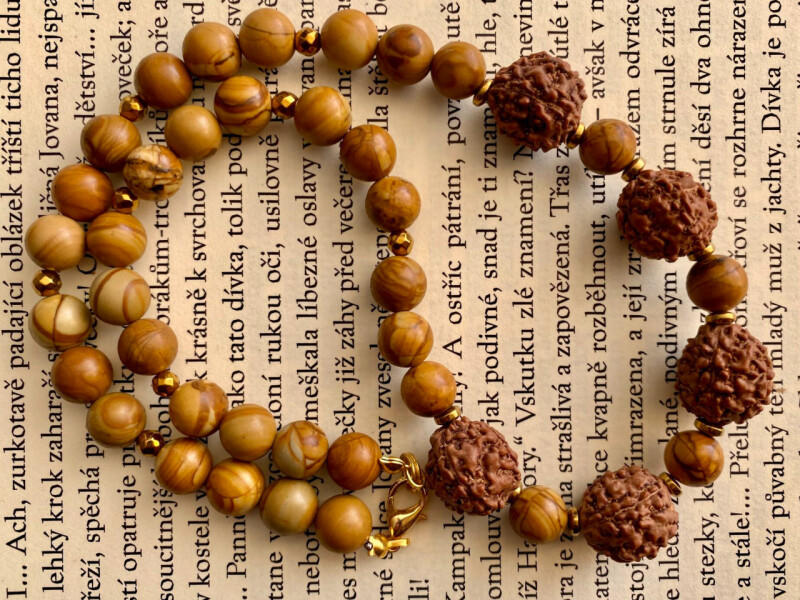 Náhrdelník z rudrakši a jaspisu pro propojení s vesmírem a zdravý život. Délka cca 42 cm.